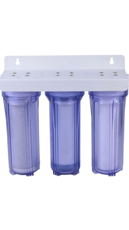 -Bộ lọc nước thô 3 cốc lọc 10 inch là thiết bị hàng đầu được sử dụng trong các hệ thống lọc nước và máy lọc nước gia đình nhằm thực hiện bước xử lý lọc thô ban đầu, giảm áp lực cho những bộ lọc tinh và các lõi lọc chức năng đằng sau. Bộ lọc nước thô 3 cốc này có thể lọc chặn hiệu quả bùn đất, tạp chất, khử mùi Clo cùng các mùi khó chịu trong nước. Bộ lọc thô này có thể sử dụng với đa dạng nguồn nước khác nhau như nước giếng khoan, nước cứng, nước nhiễm sắt,…